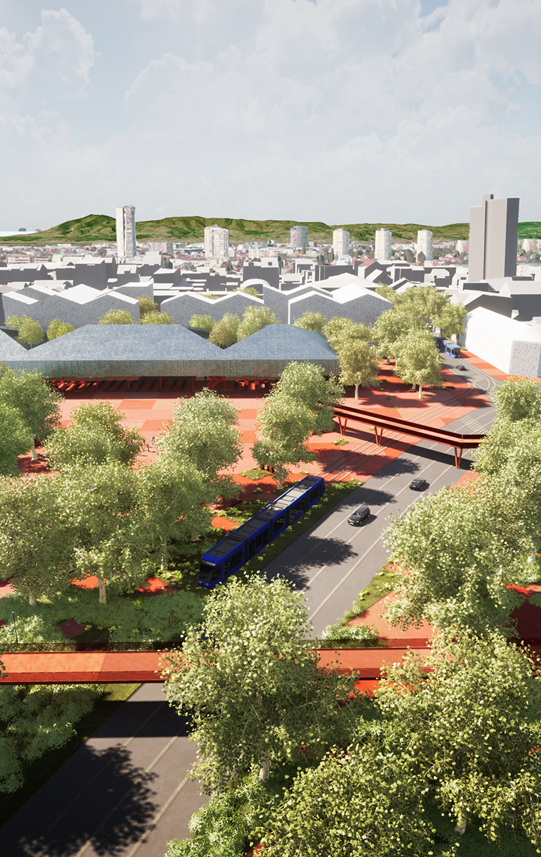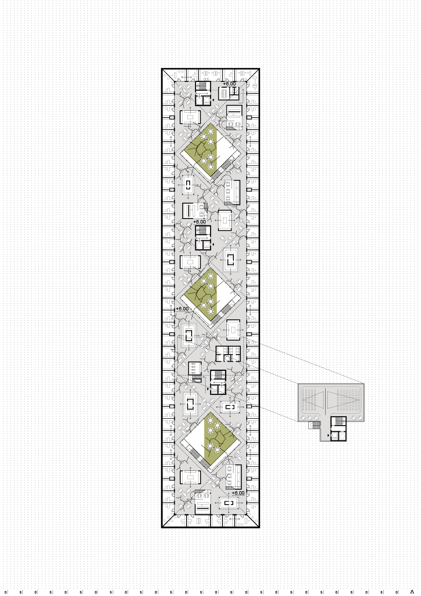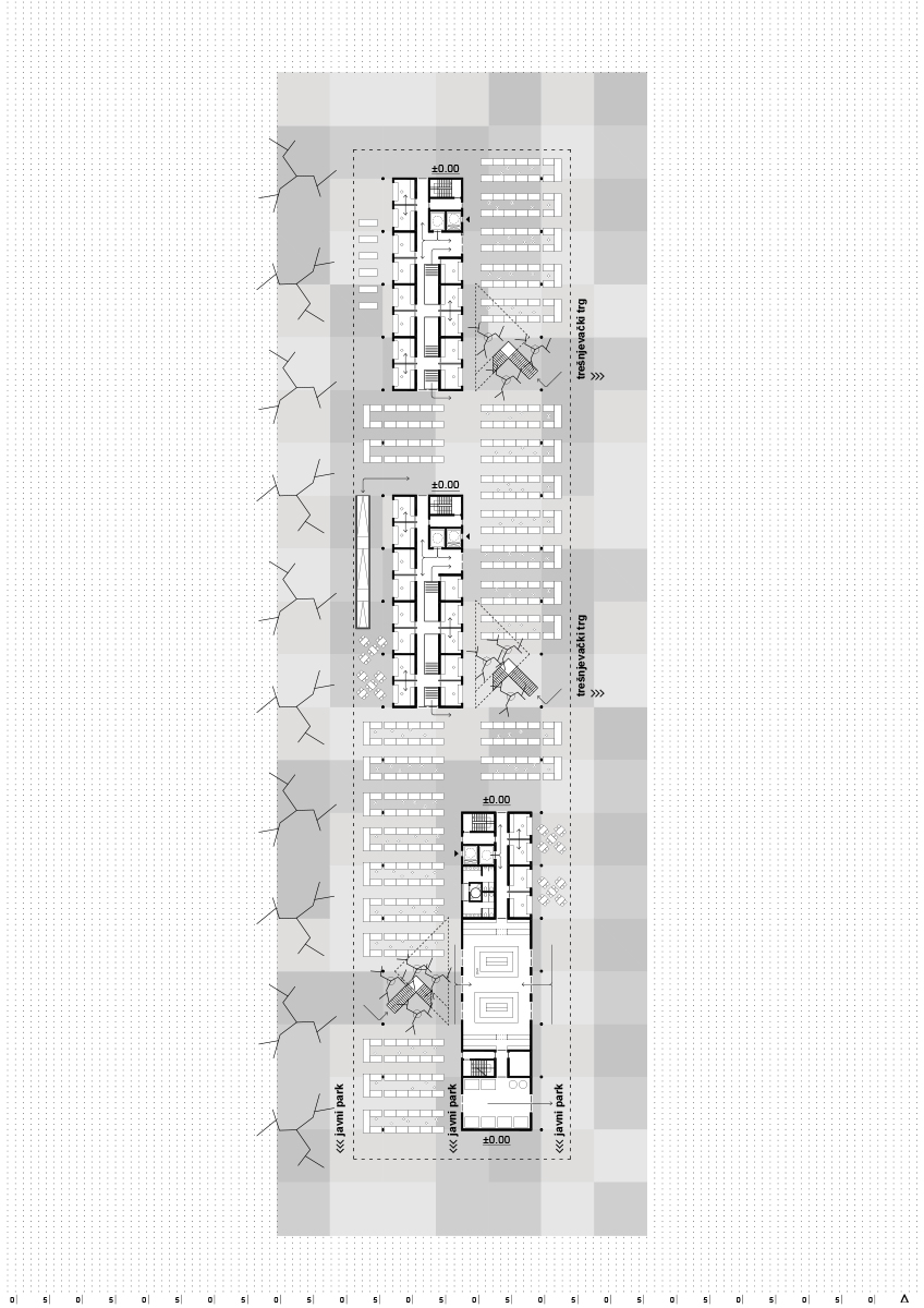 Crvena trešnjevačka zona u formi parterne obloge izraženog identiteta objedinjuje užu zonu i provlači se kroz prizemlje otvorene tržnice, polja obodnih parkova, kontaktnu zonu prometnica i javnog prometa, te prelazi preko prometnica u obliku nathodnika. Na svoju pikseliziranu matricu veže različite aktivnosti, scenarije i namjene. Tržnica je formirana kao veliki četverostrešni krov koji lebdi iznad crvenog partera i natkriva otvorenu površinu tržnice. Izvan radnog vremena ona pripada trgu i parku. Izmaknuti prizemni zatvoreni prostori podržavaju ideju parternih prolaza kroz zapadni stambeni blok i istovremeno ostvaruju natkrivenu cjelinu s trgom, gradski trijem. Izmicanjem najjužnijeg prizemnog volumena formira se komunikacija između trga i južnog parka blokirajući kontakt s dostavom i gospodarskom zonom.