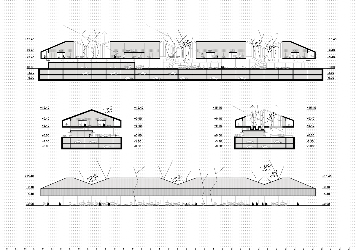 U krovu se nalazi zatvorena tržnica. Veza između trga, natkrivene tržnice i zatvorene tržnice na katu ostvaruje se preko tri velika atrija, zatvorena dvorišta. Atriji osiguravaju ugodnu mikroklimu u etaži krova, te osvjetljavaju duboku širinu prizemnog trijema. Geometrija krova je usitnjena i pripada kontekstu Trešnjevačke matrice.