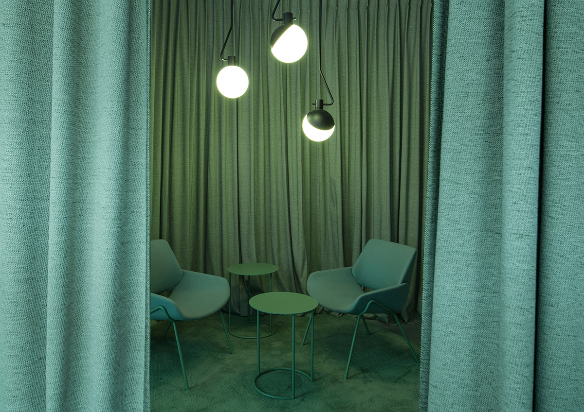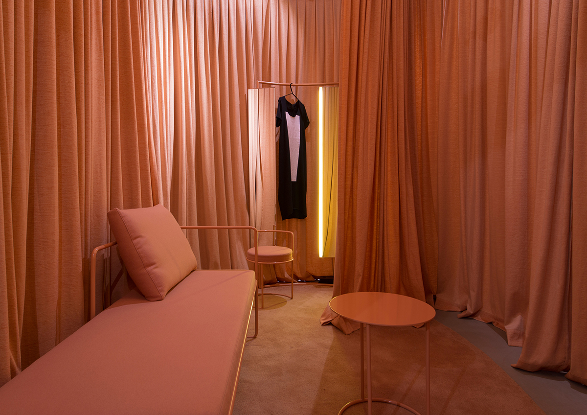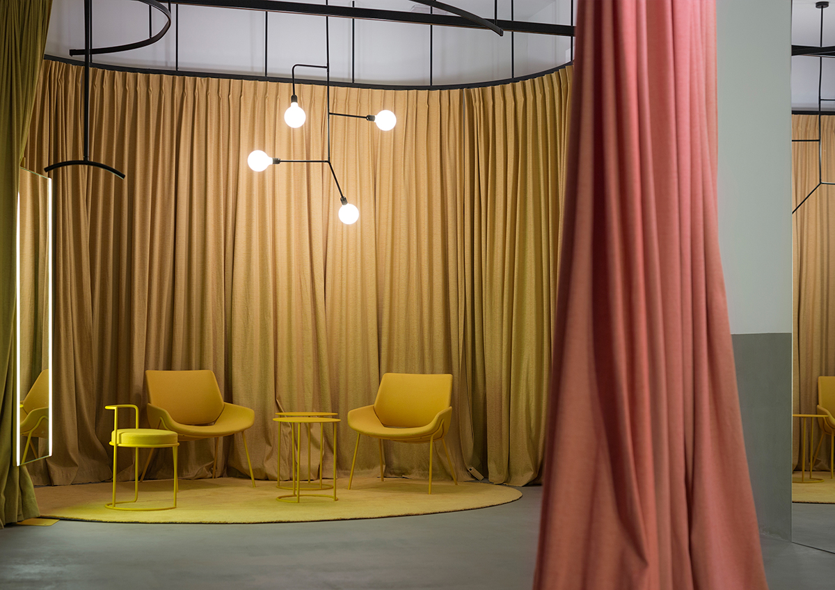 Tri garderobe pretvorene su u prostorne atrakcije s povećanim površinama i namještajem. Njihove meke forme, kolorit i materijalnost u kontrastu su s minimalistički neutralnom bazom prostora koju čine pod i visoki sokl s betonskim premazom te zidovi bijele boje. Svaka garderoba ima vlastitu kromatsku temu (meke nijanse žute, ružičaste i zelene) kojom su definirani elementi unutar garderobe i daje joj posebni karakter. Preklapajuće krivulje zavjesa dozvoljavaju prilagodbu garderoba ovisno o načinu korištenja: manja veličina za individualno korištenje te veća za komotnije ili grupno korištenje.