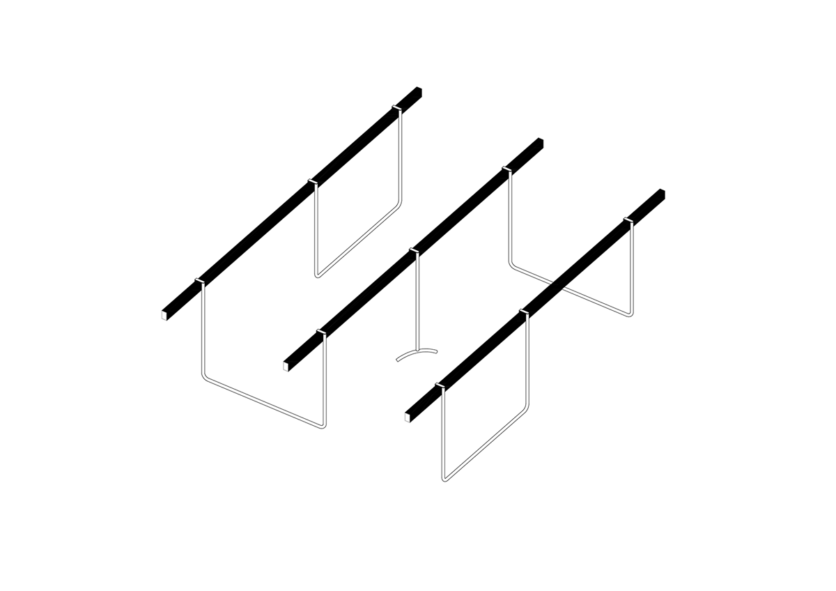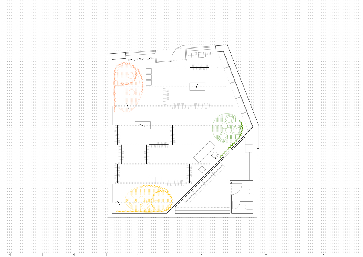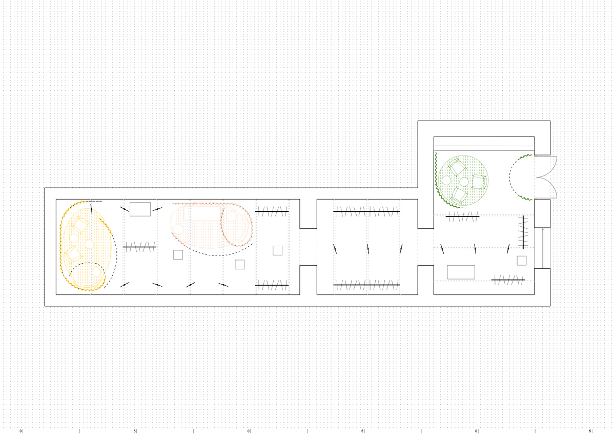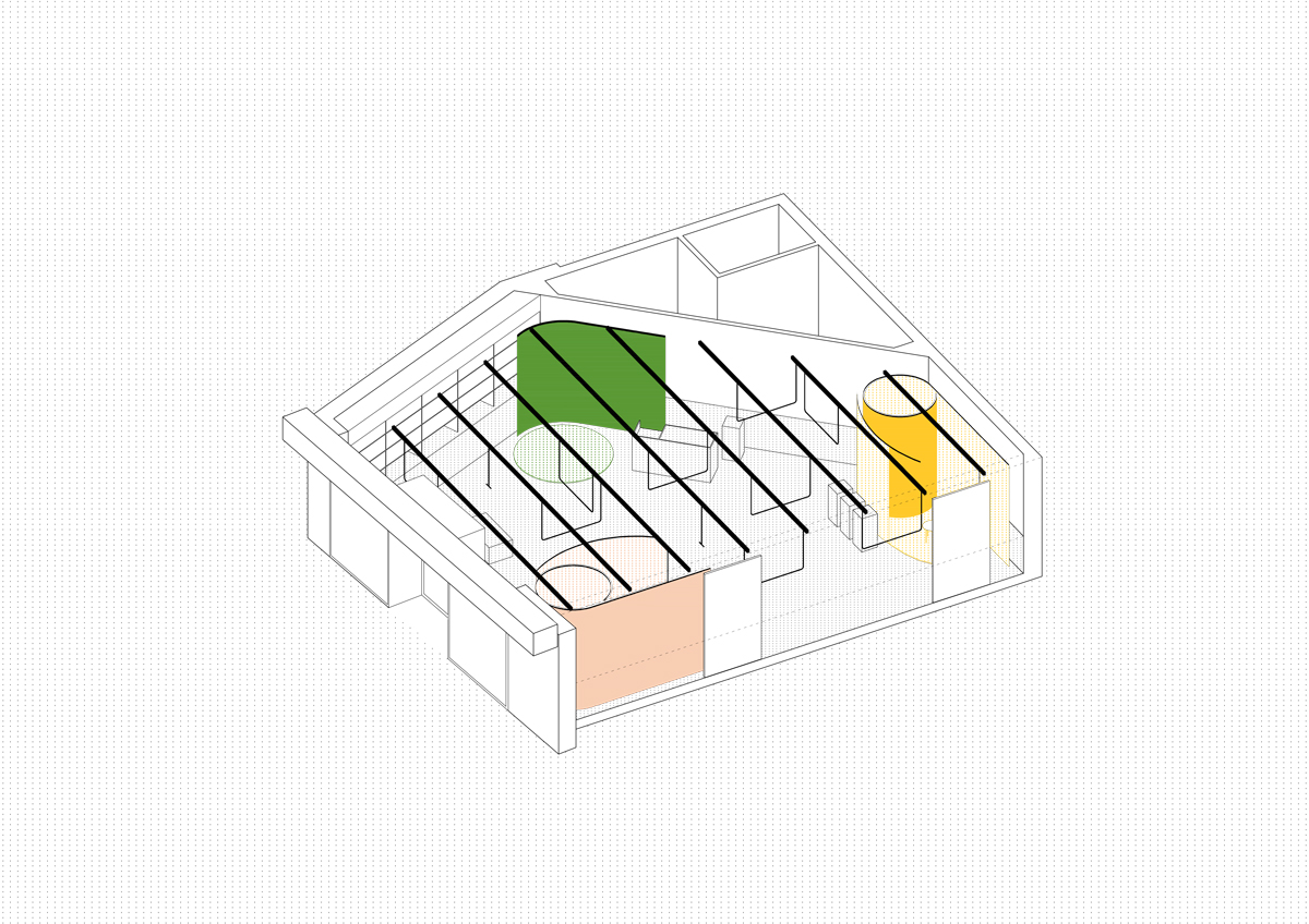 Tri garderobe pretvorene su u prostorne atrakcije s povećanim površinama i namještajem. Njihove meke forme, kolorit i materijalnost u kontrastu su s minimalistički neutralnom bazom prostora koju čine pod i visoki sokl s betonskim premazom te zidovi bijele boje. Svaka garderoba ima vlastitu kromatsku temu (meke nijanse žute, ružičaste i zelene) kojom su definirani elementi unutar garderobe i daje joj posebni karakter. Preklapajuće krivulje zavjesa dozvoljavaju prilagodbu garderoba ovisno o načinu korištenja: manja veličina za individualno korištenje te veća za komotnije ili grupno korištenje.