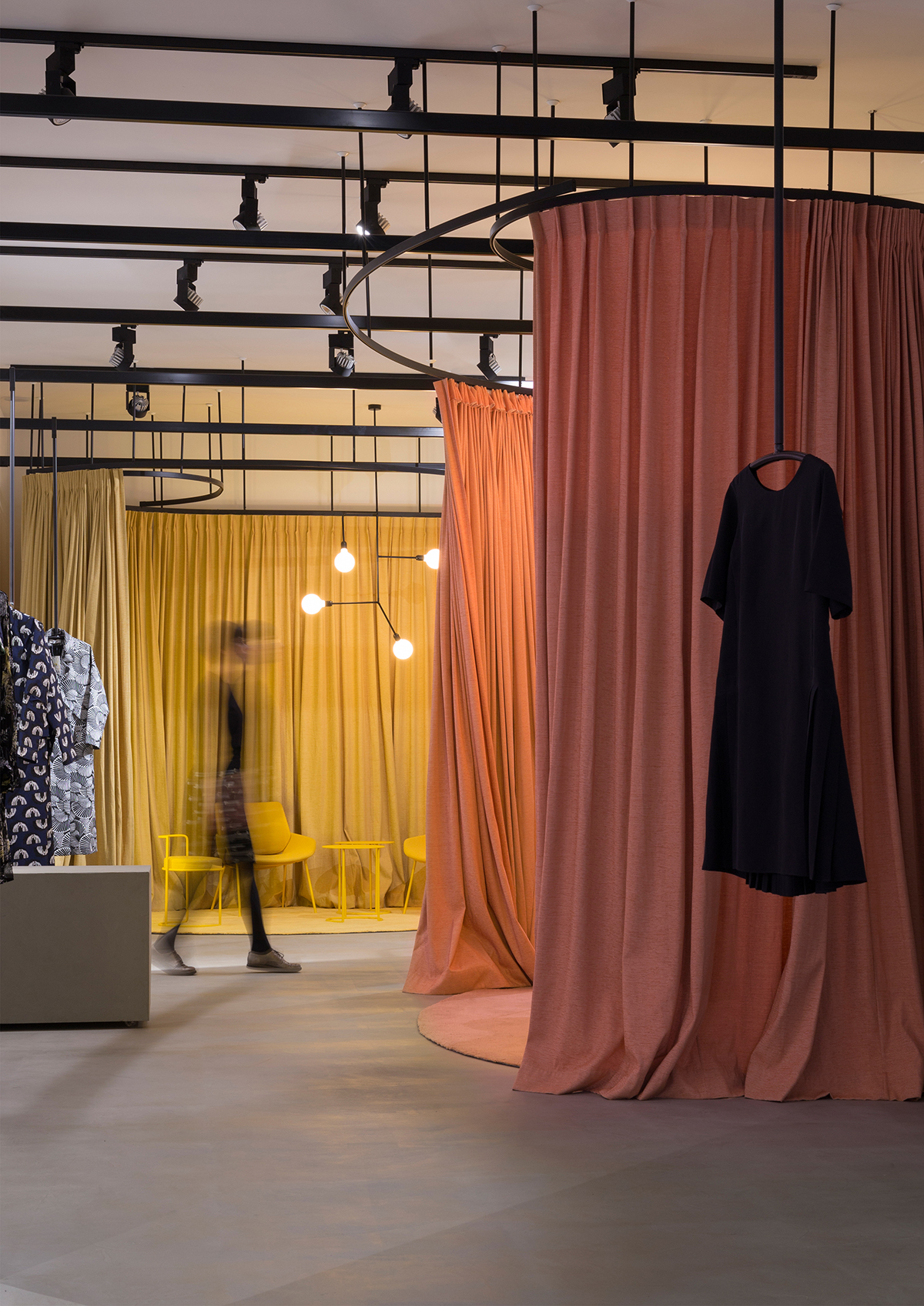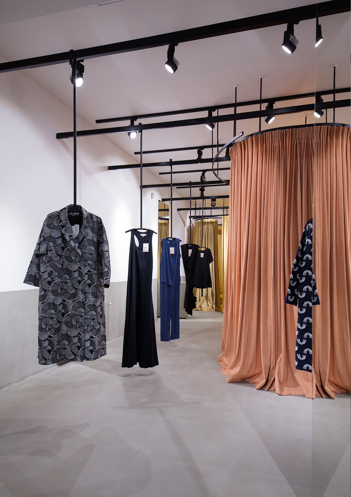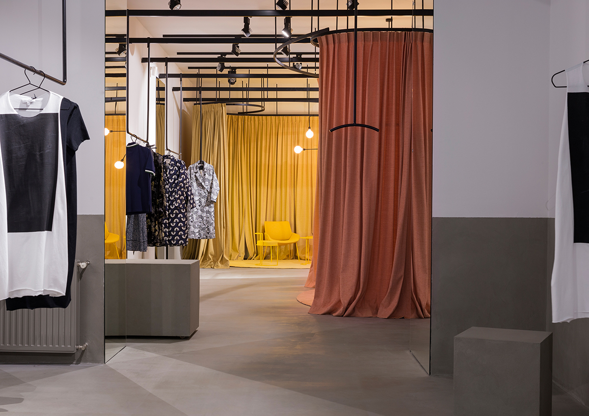 Predimenzionirane garderobe pastelnih tonova s usklađenim monokromatskim namještajem definiraju atmosferu concept store-a Garderoba. Interijer je koncipiran na filozofiji slow-shoppinga: ležernom doživljaju kupovine.