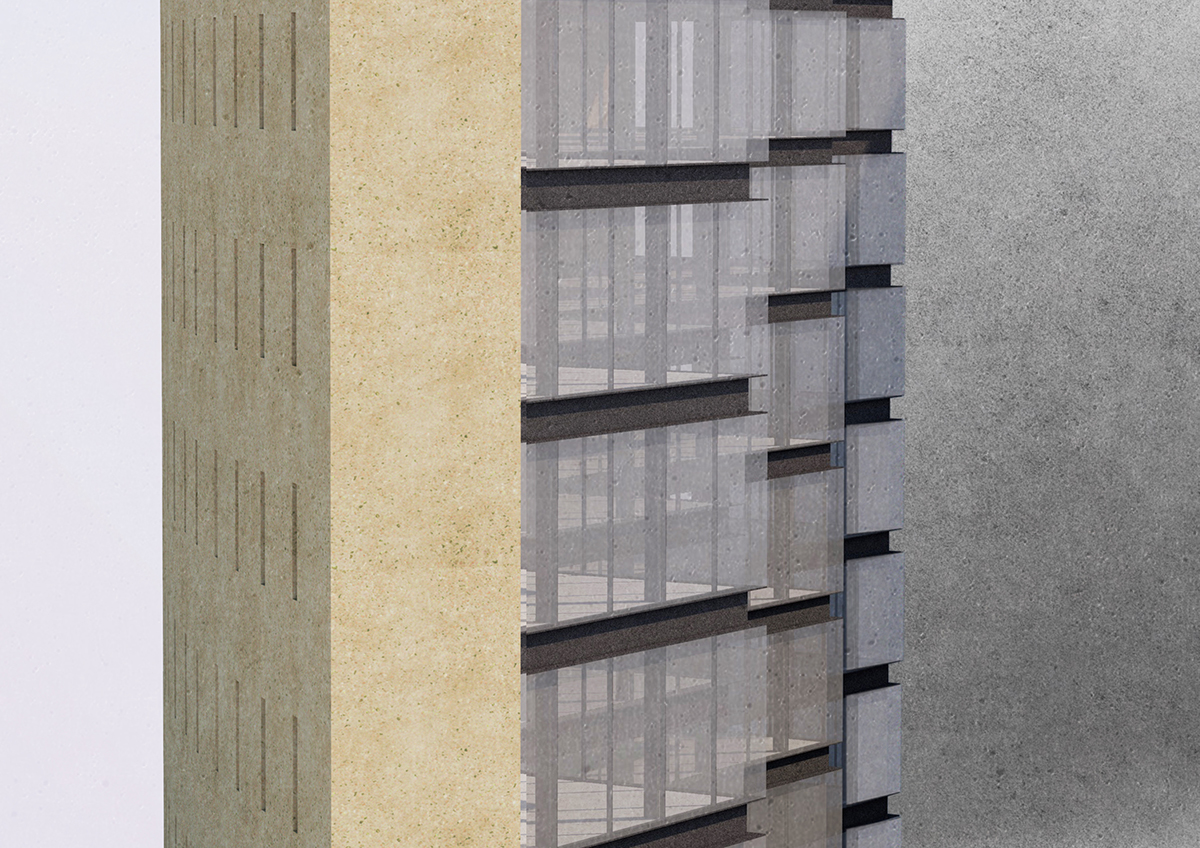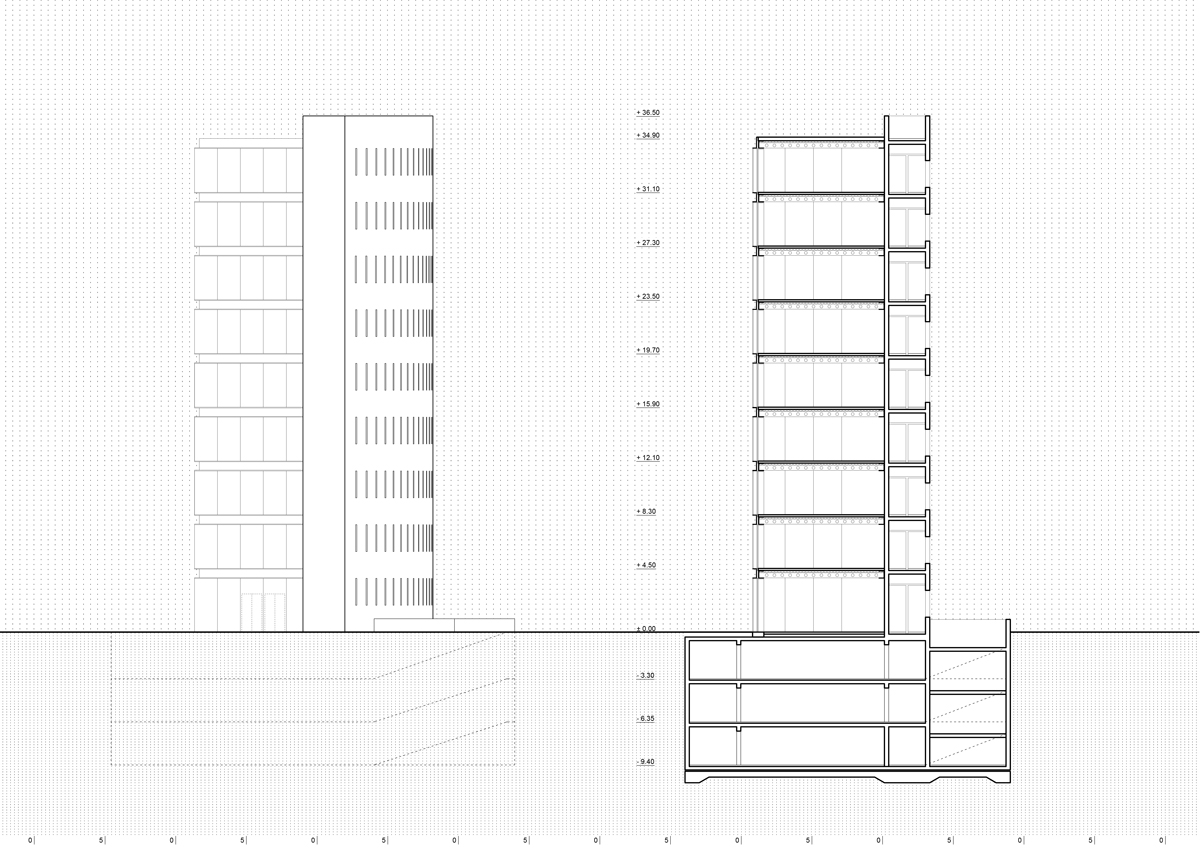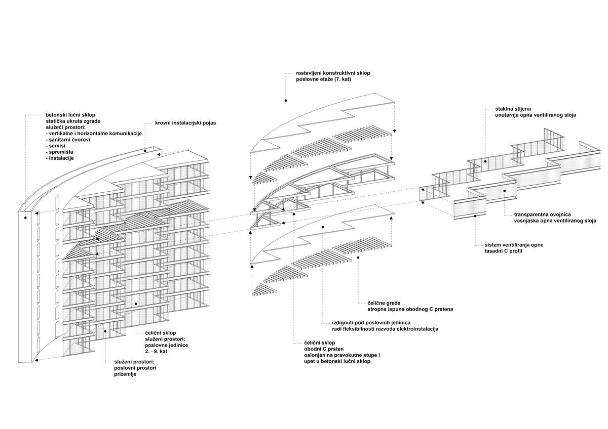 Urbanistički uvjeti zadane parcele u zagrebačkoj poslovnoj zoni određuju izlomljenu i na dijelove veoma suženu zonu izgradnje s otežanom mogućnošću realizacije konvencionalne tipologije: poslovna zgrada sa središnjom jezgrom koja servisira okolne radne prostore i vertikalno povezuje sve etaže minimizirajući utrošak kvadrature na samu komunikaciju.Uzdignut je volumen koji prati obrise moguće tlocrtne izgrađenosti s diferenciranim sjevernim lukom koji objedinjuje izlomljene južne istake. Utoliko, program jasno dobiva svoje oblikovanje - longitudinalni komunikacijski koridor koji servisira segmentirane radne prostore.