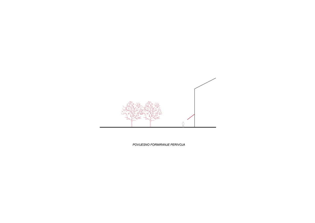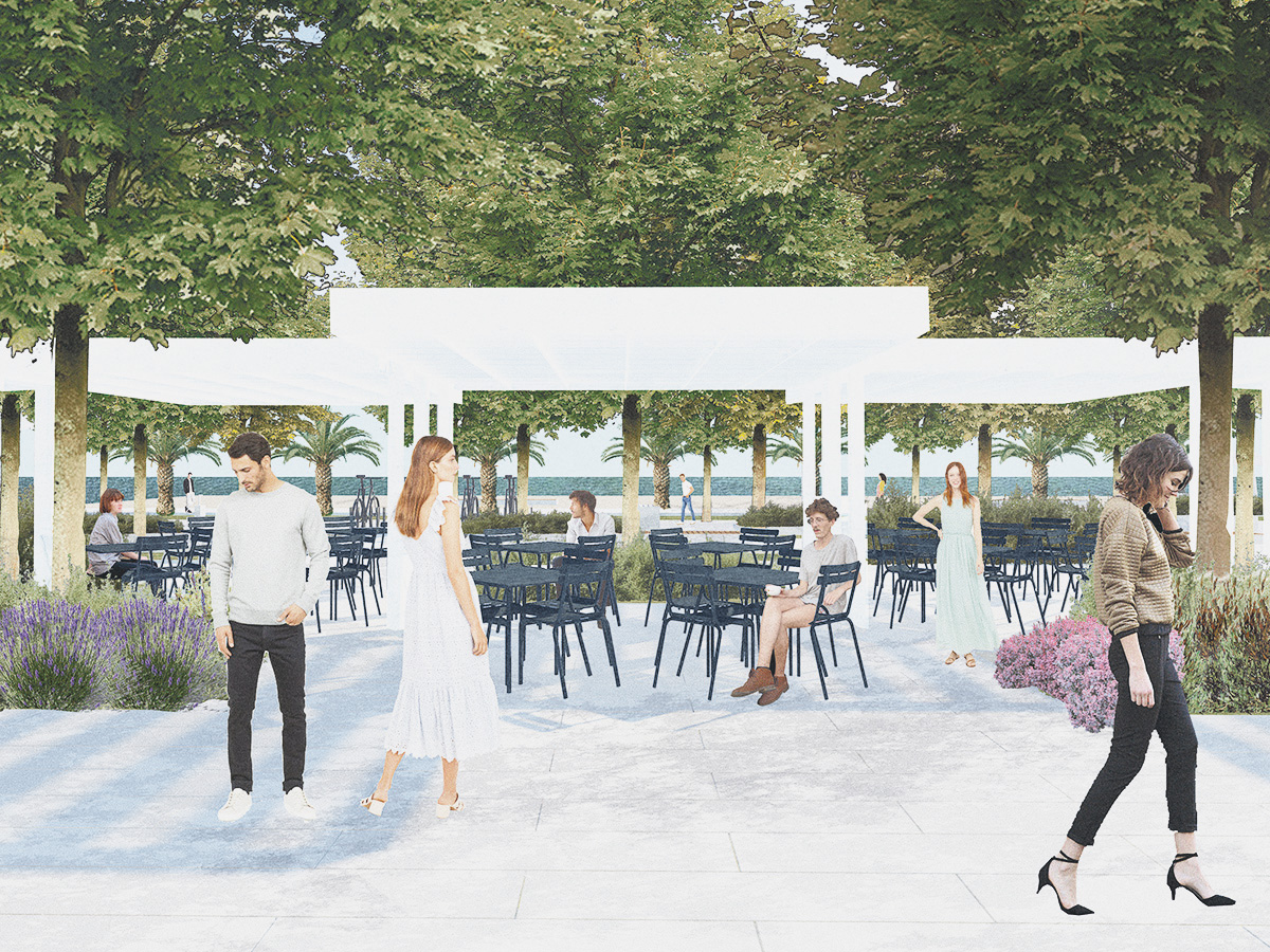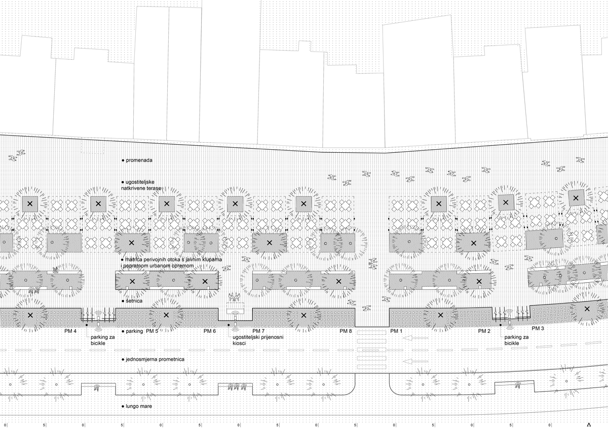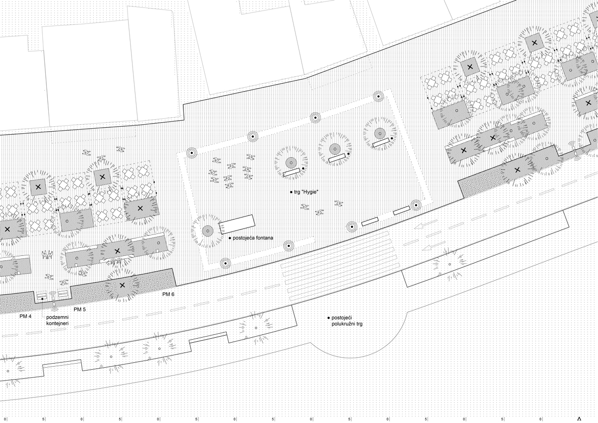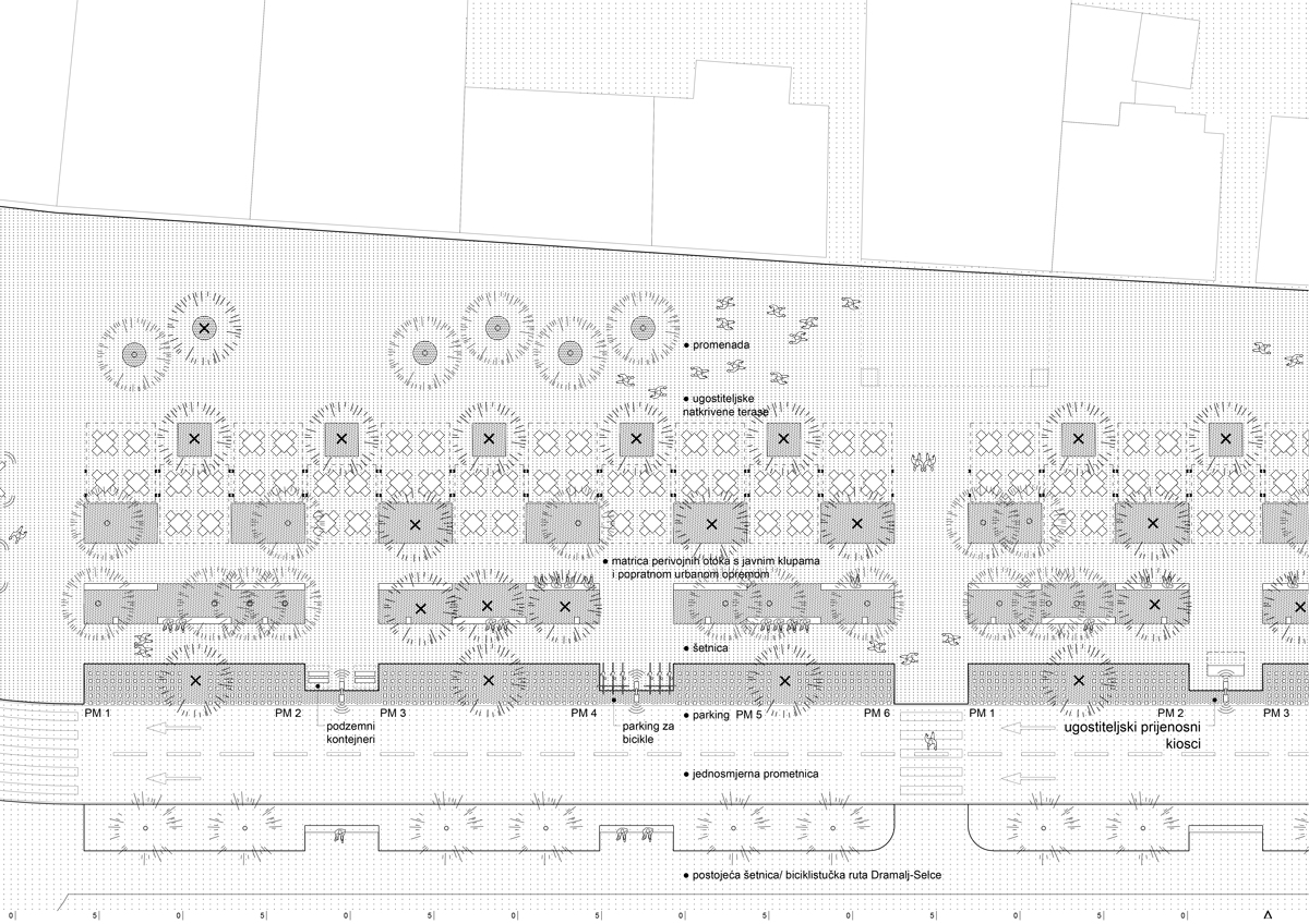Oblikovanje novo uređenog trga S. Radića sugerira sklad između visoke potrebe za terasama te iznimno vrijednog nasljeđa aleje drvoreda. Unificirane strehe lineranog doživljaja podmeću se pod krošnje minimalizirajući vizualni naglasak. U nastavku te misli, sama šetnice poprima jednaki tretman. Obostranim nadopunjavanjem zatečenog dvoreda, strehe terasa i promet u mirovanju podvinuti su unutar presjeka šetnice te se akcent doživljaja vraća na sama stabla.