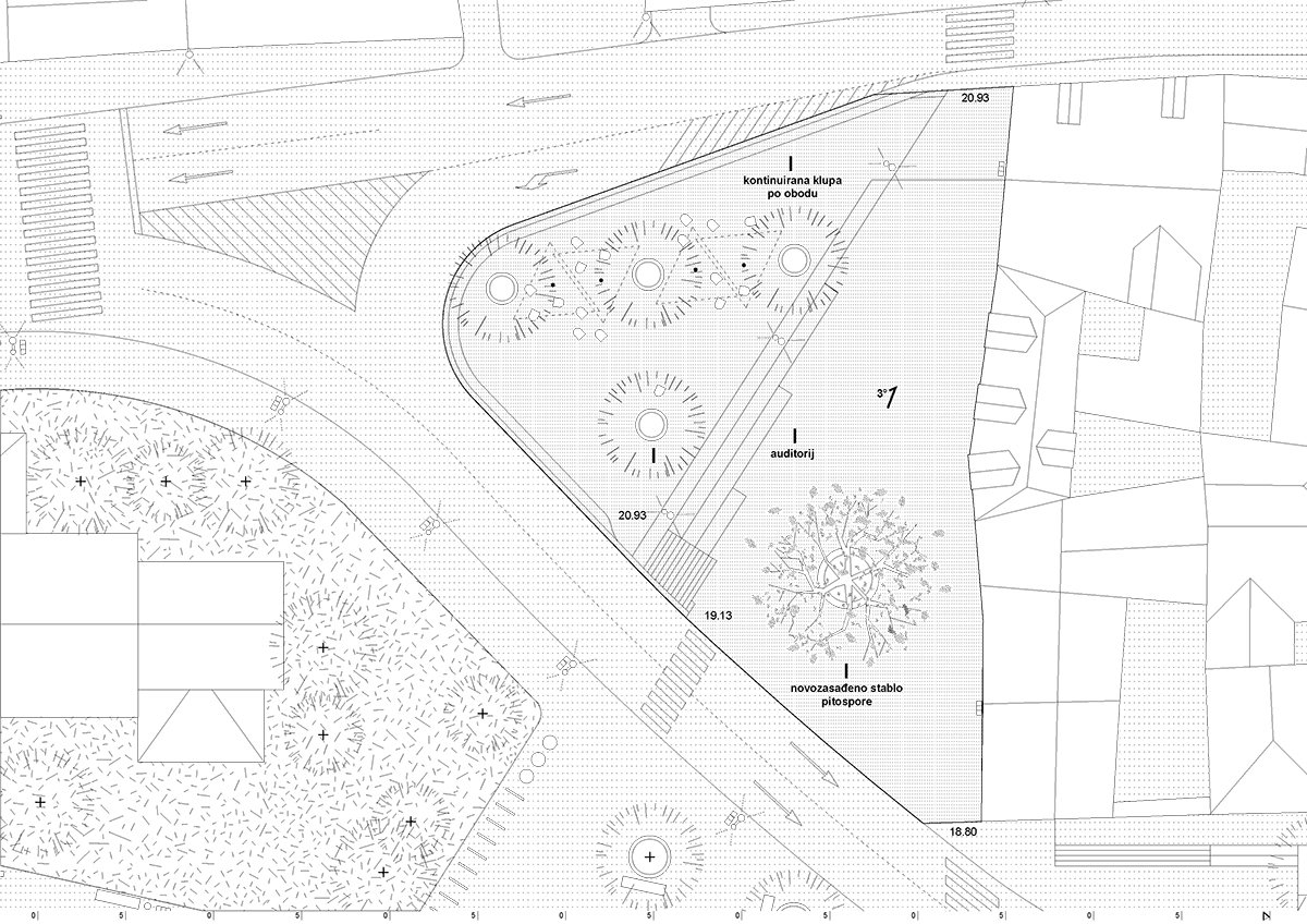 Rješenje šireg područja stavlja naglasak na sigurnost pješaka. Novo rješenje uređenja Vanjskog karakterizira dvojaki način korištenja: mjesto je ujedno i prolazno i mjesto zadržavanja, susreta. Dvojnost i opreke zatečenog stanja i korištenja prostora su okosnica novog koncepta prostora Vanjskog. Formirane su dvije zone prostora koje se razlikuju u načinu korištenja i postignutoj atmosferi, ali objedinjene u oblikovnom jeziku. Kosa ploha trga je glavna pješačka komunikacija koja povezuje sjeveroistočni dio grada Šibenika s južnim dijelom i prodorom prema obali. Ploha ujedno prati postojeće visinske kote ulaza u kafiće i lokale. Sadi se novo stablo pitospore koje postaje žarišna točka.