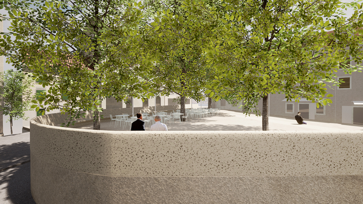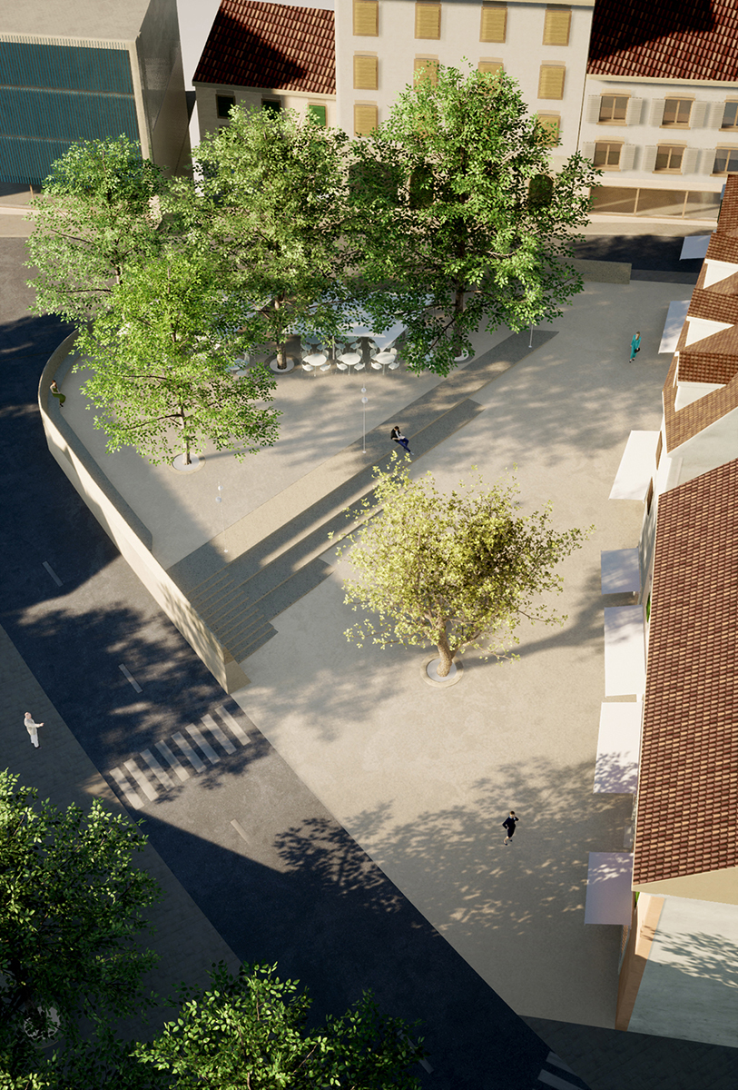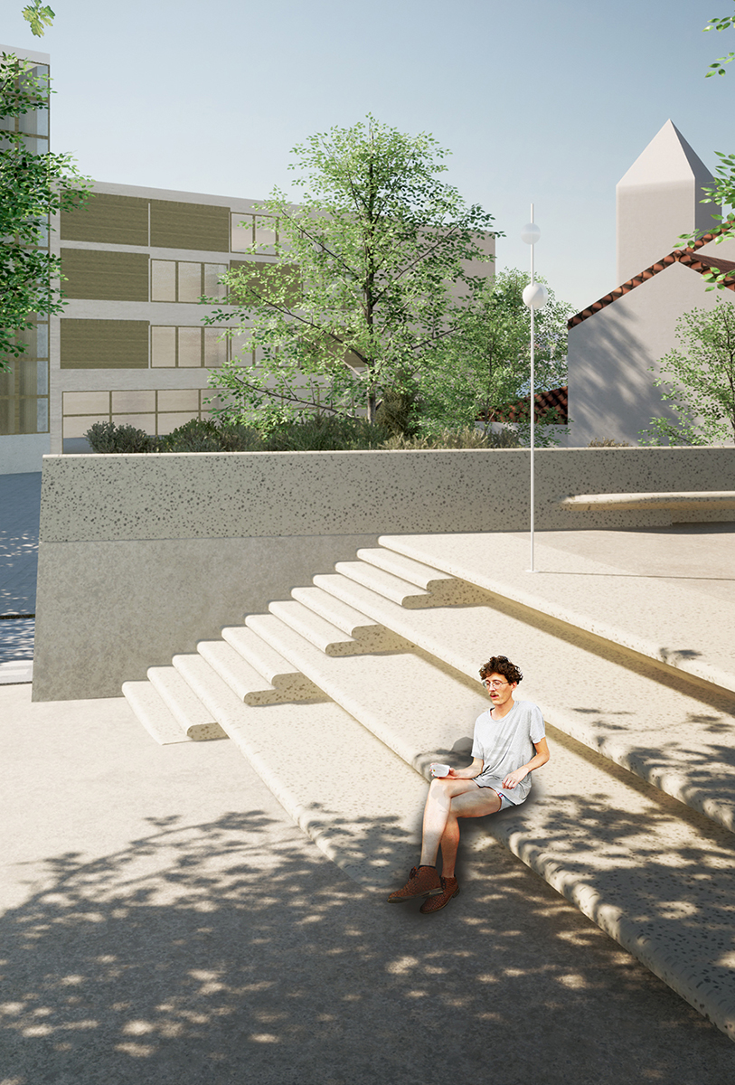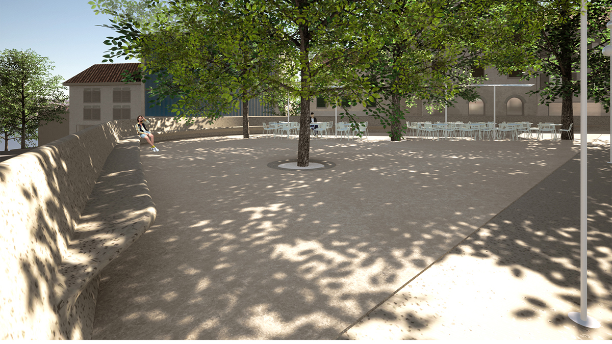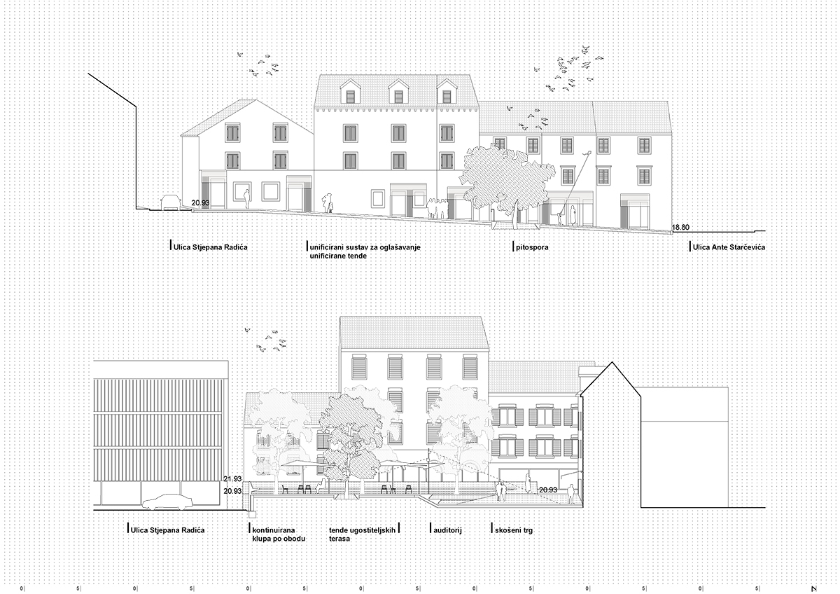 Drugi segment je izravnata ploha koja se nadvisuje iznad prometnica, obgrljena je kontinuiranom klupom s fokusom na trg. Korisnici uživaju u terasama ugostiteljskih objekata ili na javnoj klupi, u lijepim vizurama, zaštićeni od prometa u ugodnoj hladovini brijestova. Duga kontinuirana klupa, stablo u fokusu, povišene izravnate platforme, česti su motivi u arhitekturi mediteranskih trgova i javnog prostora, ovdje artikulirani kao odgovor na potrebe lokacije i prepoznate vrijednosti.