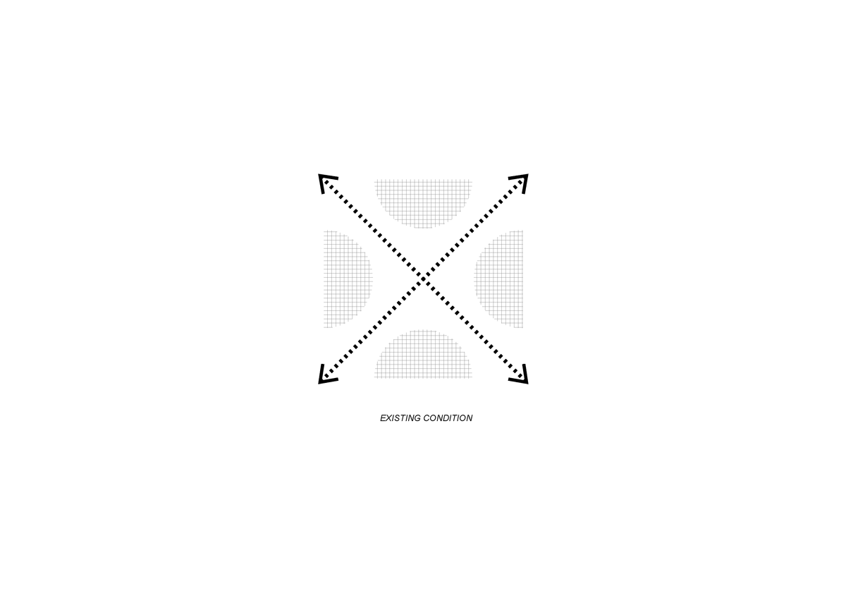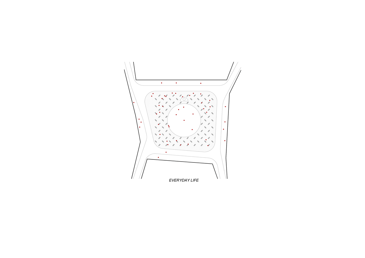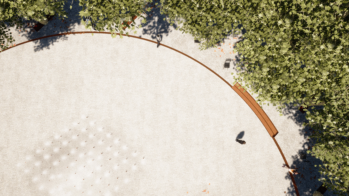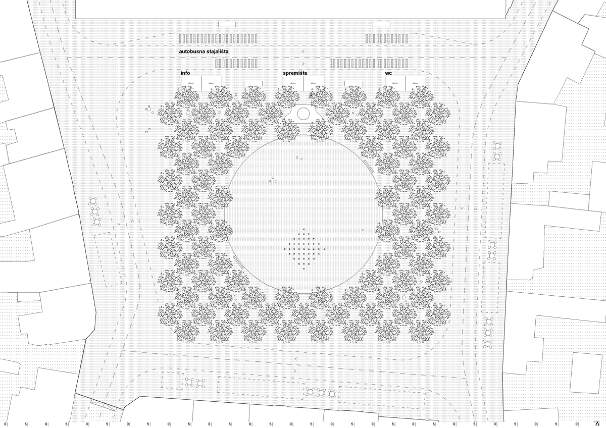 Zadržana je blaga kosina postojećeg terena, osim u dijelu središnje kružne platforme koja je izravnata. Tektonskim pomakom, tj. izravnavanjem plohe stvorena je visinska razlika od maksimalno 45 cm. Tim postupkom je naglašena centralna kružna zona te je stvorena kontinuirana površina koja poziva na spontano sjedenje. Geometrija je to koja podržava ideju centralne platforme kao prostor događaja i aktivnosti popraćenih sa slučajnom ili namjernom publikom.